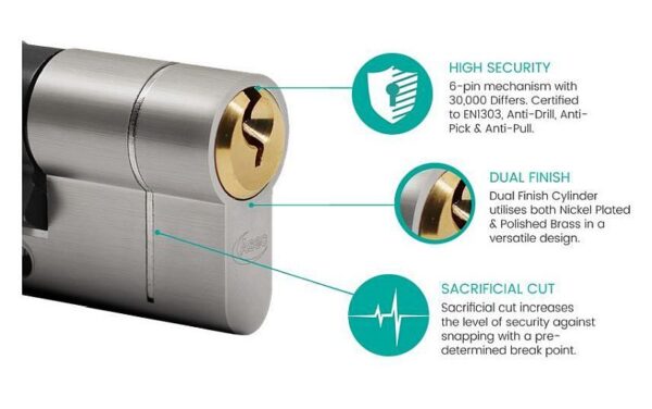 The Asec Vital dual finish 6-Pin Key & Turn Oval cylinder has a combined finish of a nickel plated body and a polished brass plug, this gives you a stylish cylinder that is suitable for use in both nickel and brass applications. These cylinders are drill, pick and pull resistant and have a sacrificial cut that increases the level of security against snapping with a predetermined break point.