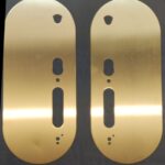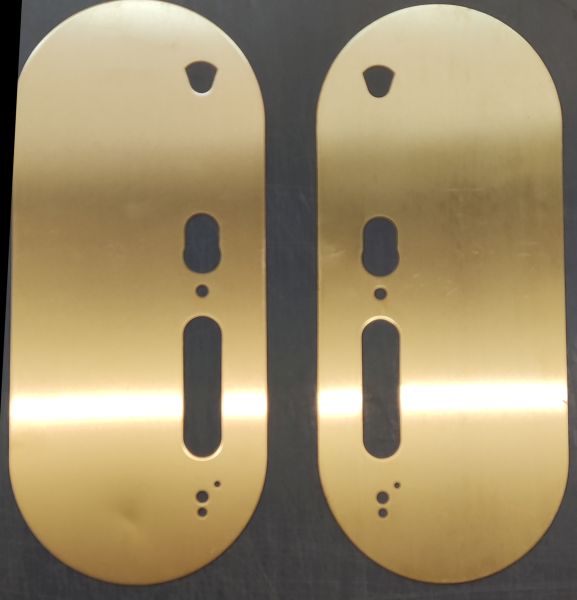 Lock-Tech offset cover plate. Plate to sit behind Salto to hide marks from previous door furniture etc. Satin brassl finish. 351.5x150mm