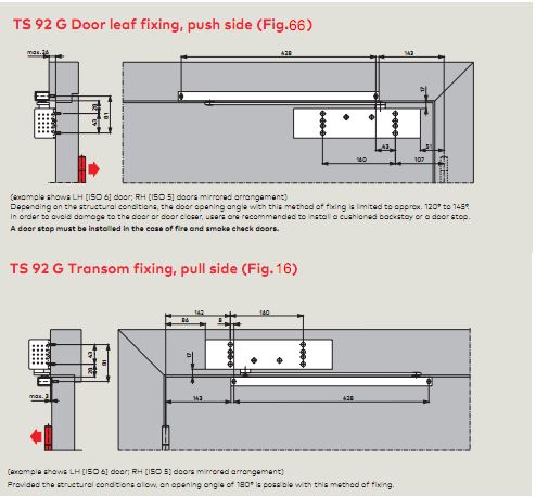 Door leaf fix push side or transom fix pull side. Adjustable closing force, closing speed and latching speed