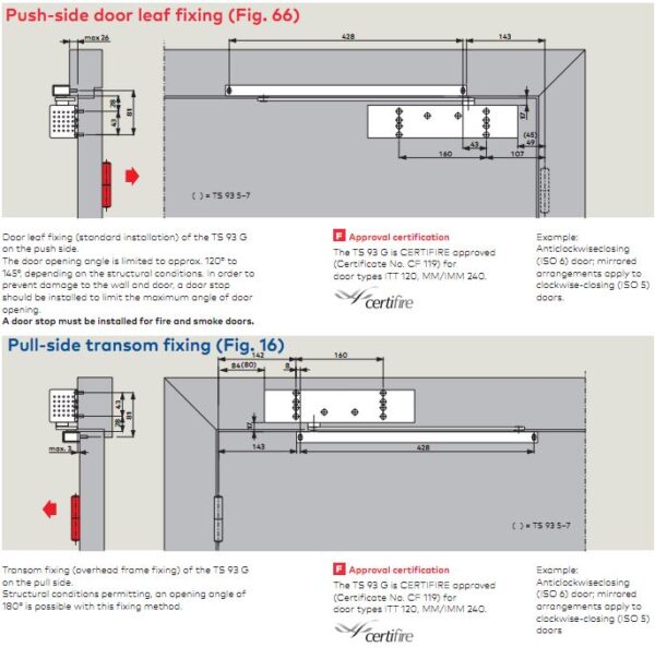 Door leaf fix push side or transom fix pull side. Adjustable closing speed, latching speed, backcheck and delayed action