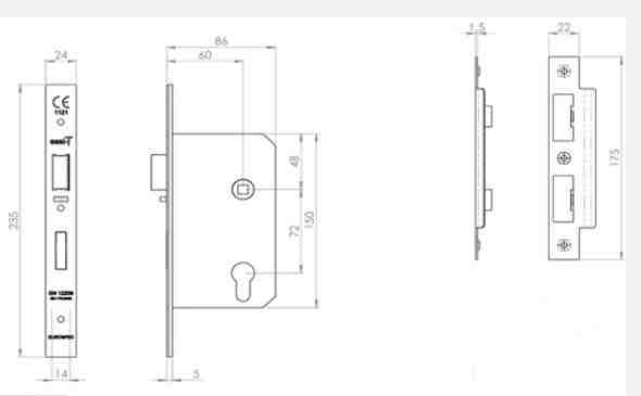 Din Standard Mortice Escape Lock With 60mm Backset And 72mm Centres. En12209. Fd30/60. Finish: Satin Stainless Steel. Category Of Use Grade 3. Complete with Split Spindle. Requires pair Levers and Euro Cylinder (Double or Key & Turn).