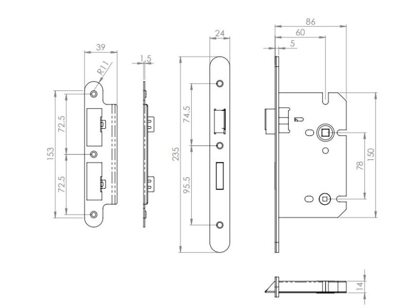 DIN Standard Mortice Bathroom Lock With 60mm Backset & 78mm Centres, T/Turn Follower 5mm. 10yr Mechanical Guarantee. Conforms to BS EN 12209. Certifire Approved. Suitable for FD30/60 rated fire doors. Finish: Satin Stainless Steel. Category Of Use Grade 3. Please note, this lock has Radiused forend and faceplate