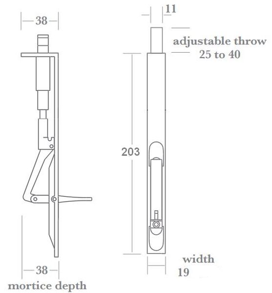 Lever action flush bolt, 203x19mm. Shoot size: 11 diameter. Adjustable length of throw between 25-40mm. High quality coil spring. Smooth easy action. Fully retractable shoot. Satin Chrome finish.