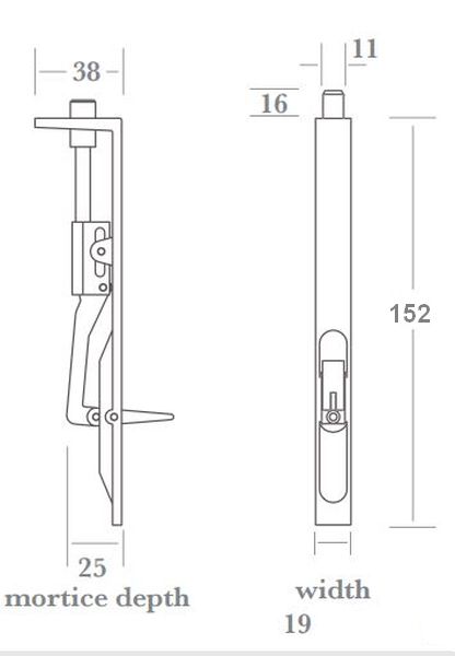 Lever action flush bolt, 152x19mm. Shoot size: 11 diameter. Length of throw: 16mm.