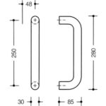 Straight handle in a curved shape, with straight supports, for mounting on leaf doors, in conjunction with BA5.0 for frame doors.