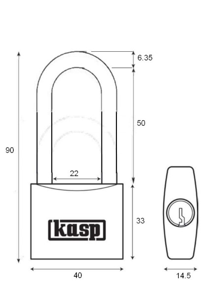 40mm body width. 6.35mm shackle. 50mm shackle height.
