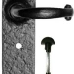 Black antique malleable iron lever handle with bathroom/privacy fitting. Spring loaded. Two coat protective finish. Bathroom, latch and lock options available (bathroom version shown). Also available in cast brass, pewter and argent.