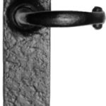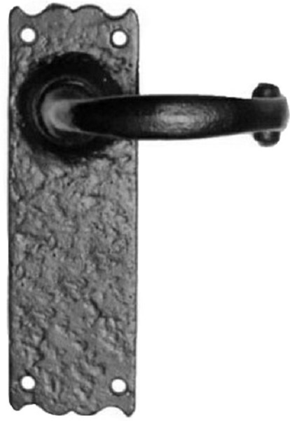 Black antique malleable iron lever handle with bathroom/privacy fitting. Spring loaded. Two coat protective finish. Bathroom, latch and lock options available (latch version shown). Also available in cast brass, pewter and argent.