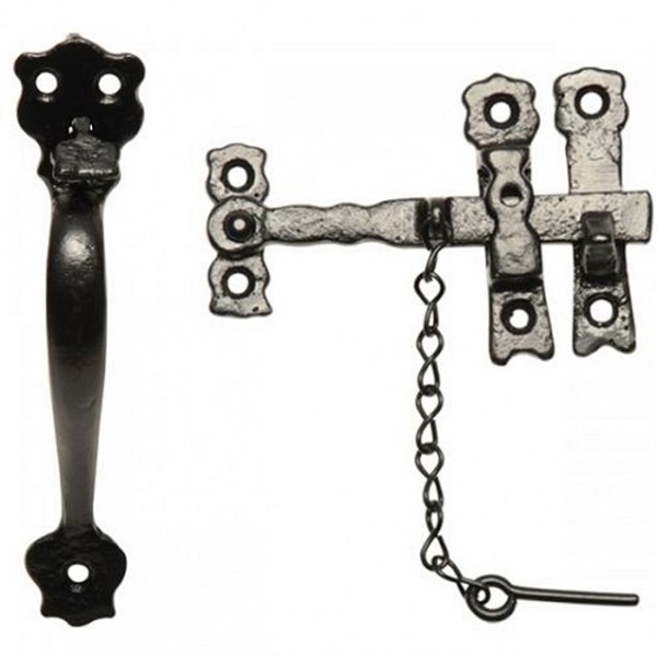 Antique Black Malleable Iron Thumb Latch Set. C/W PRIVACY CHAIN