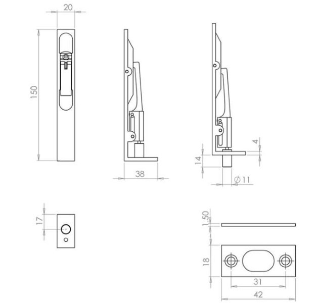 A lever action door bolt used mainly on pairs of doors to secure the first closing leaf to enable the second leaf to be locked securely. 150mm height x 20mm width. Finish: Satin Stainless Steel.