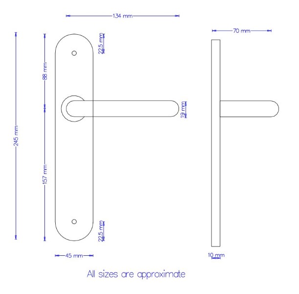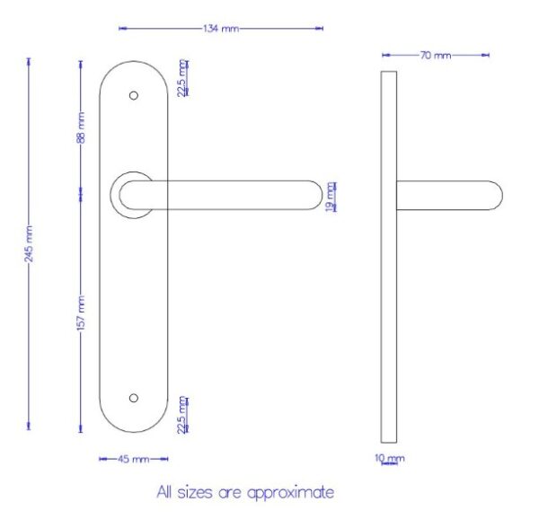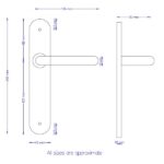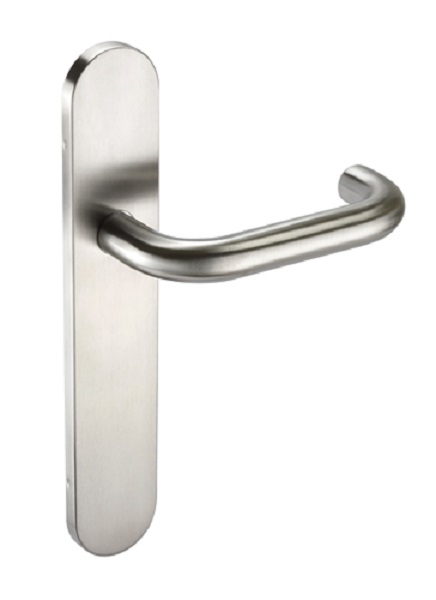 19mm Sprung Safety Lever on Latch Radius Backplate. 245 x 45 x 10mm concealed back to back fix baseplate. 57mm Centres. Grade 304 Satin Stainless Steel.