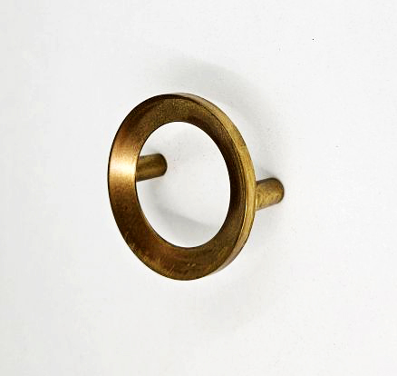 Retro drawer pull in Satin Brass finish. 57mm diameter. 21mm projection. 48mm screw centres.