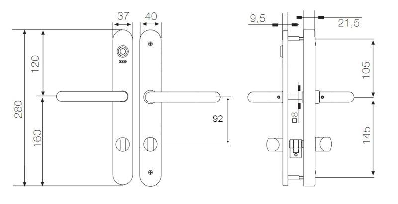 Both handles free to operate latch and lift deadbolts at 92mm centres. U shaped lever