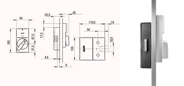 Outside escutcheon measurements: 54mm x 105mm x 28mm.
