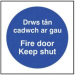 Fire Door Keep Shut – Welsh/English Sign, Self-Adhesive Vinyl (100mm x 100mm).