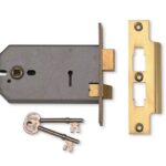 3 Lever Hor. Mortice Sashlock (6). Suits wooden doors hinged on the left or right and requiring key and handle operation. Two way action suitable for knobs or sprung lever handles. Deadbolt locked or unlocked by key from either side. Latchbolt withdrawn by knob or sprung lever handle from either side. Pierced to accept bolt through furniture.