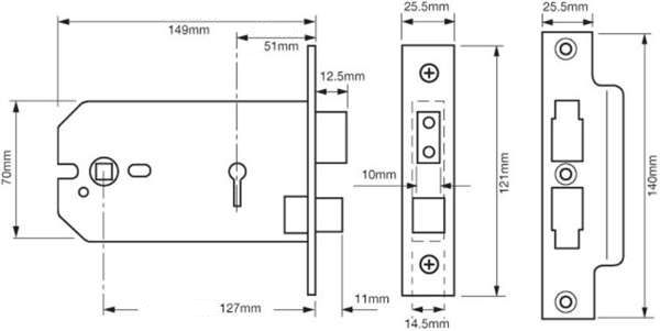 Two way action suitable for knobs or sprung lever handles. Deadbolt locked or unlocked by key from either side. Latchbolt withdrawn by knob or sprung lever handle from either side.
