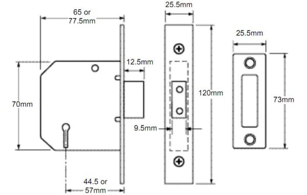 Suits wooden doors hinged on the left or right and requiring key operation only. Deadbolt locked or unlocked by key from either side. Made in the U.K.