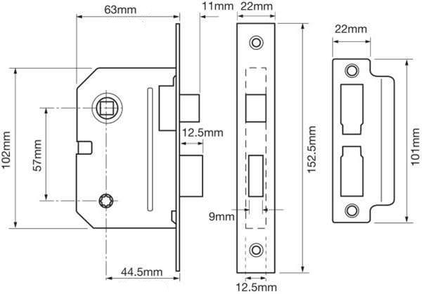 Contract Lever Mortice Bathroom Lock (2.1/2). Two way action suitable for lightway knobs or sprung handles. Deadbolt locked or unlocked by separate turn from inside. Deadbolt unlocked by separate emergency release from outside. Latchbolt withdrawn by lever handle from either side. Not suitable for unsprung lever handles. 57mm Centres 5mm T/Turn Follower 44mm Backset 63mm Case Depth Satin Finish.