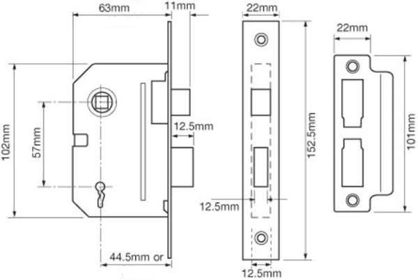 Two way action suitable for lightway knobs or sprung handles. Deadbolt locked or unlocked by key from either side. Latchbolt withdrawn by lever handle from either side. Keys suitable for doors upto 55mm thick when using 8mm thick furniture plates.