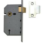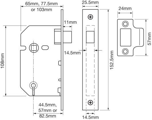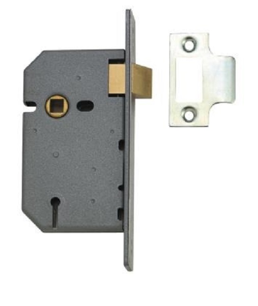 Latchbolt withdrawn by lever handle from either side. Pierced to accept bolt through furniture.