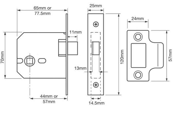 Latchbolt withdrawn by lever handle from either side. Pierced to accept bolt through furniture.