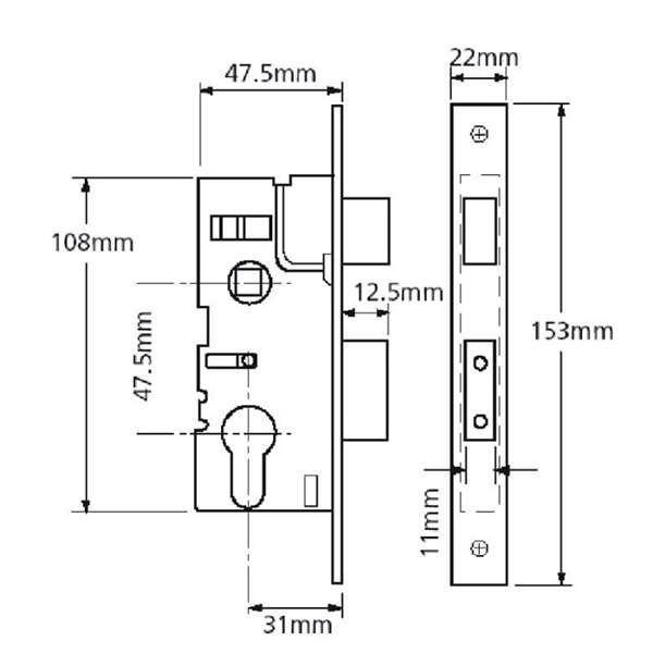 Special Purpose Euro profile sashlock case for Residential Aluminium Doors. Deadbolt locked or unlocked by cylinder key or cylinder turn. Latchbolt withdrawn by lever handle. Latchbolt can be withdrawn by key. Suitable for use with narrow plate unsprung lever handles. Details available upon request.